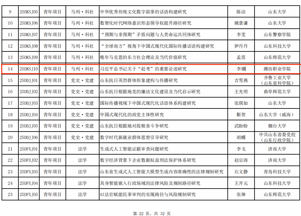 近日,山东省哲学社会科学工作办公室公布了2025年度山东省社科规划研究项目立项名单。马克思主义公司李璐老师申报的《习近平总书记关于“赶考”的重要论述研究》获批青年项目立项全省高职院校仅获批3个项目。此次立项实现了马克思主义公司在高层次科研项目上的新突破展现了院在社科研究领域的持续积淀与创新活力,为公司科研高质量发展注入新动能
